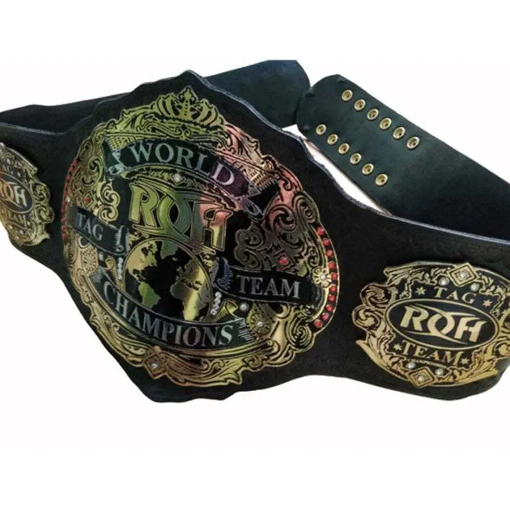Step into the world of wrestling with the ROH replica championship belt. This belt brings the excitement of Ring Of Honor right to your hands. Fans and collectors love the classic look and solid craftsmanship. Each ROH replica championship belt features detailed metal plates with bold engravings. The center plate highlights the Ring Of Honor logo and the words 'World Tag Team Champions'.